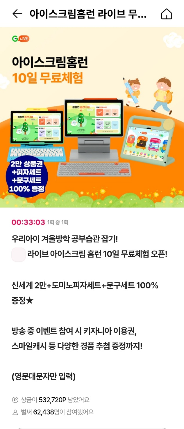 - 문제: 우리아이 겨울방학 공부습관 잡기! ○라이브 아이스크림 홈런 10일 무료체험 오픈! 신세계 상품권 2만 원 + 도미노피자 세트 + 문구세트 100% 증정★ 방송 중 이벤트 참여 시 키자니아 이용권, 스마일캐시 등 다양한 경품 추첨 증정까지! (영문 대문자만 입력)