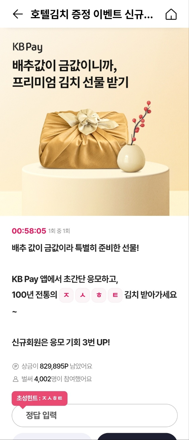 배추 값이 금값이라 특별히 준비한 선물! KB Pay 앱에서 초간단 응모하고, 100년 전통의 ○○○○ 김치 받아가세요~ 신규회원은 응모 기회 3번 UP!