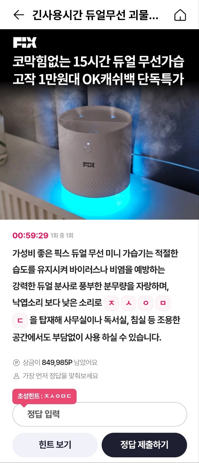 - 문제: 가성비 좋은 픽스 듀얼 무선 미니 가습기는 적절한 습도를 유지시켜 바이러스나 비염을 예방하는 강력한 듀얼 분사로 풍부한 분무량을 자랑하며, 낙엽소리 보다 낮은 소리로 ○○○○○을 탑재해 사무실이나 독서실, 침실 등 조용한 공간에서도 부담없이 사용 하실 수 있습니다.