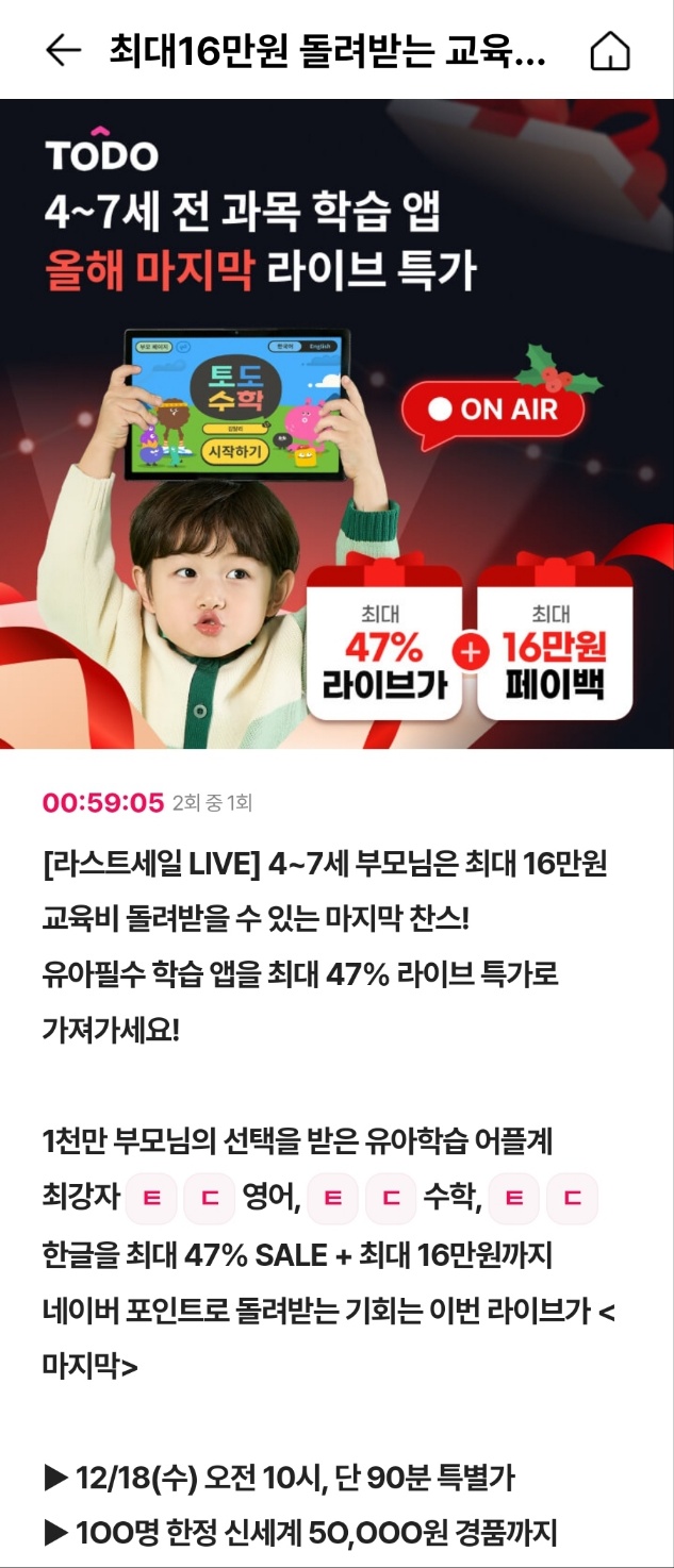 - 문제: [라스트세일 LIVE] 4~7세 부모님은 최대 16만원 교육비 돌려받을 수 있는 마지막 찬스! 유아필수 학습 앱을 최대 47% 라이브 특가로 가져가세요! 1천만 부모님의 선택을 받은 유아학습 어플계 최강자 토도○○, 토도수학, 토도한글을 최대 47% SALE + 최대 16만원까지 네이버 포인트로 돌려받는 기회는 이번 라이브가 <마지막> ▶ 12/18(수) 오전 10시, 단 90분 특별가 ▶ 1OO명 한정 신세계 5O,OOO원 경품까지 진짜 라스트 세일 만나러 오세요!