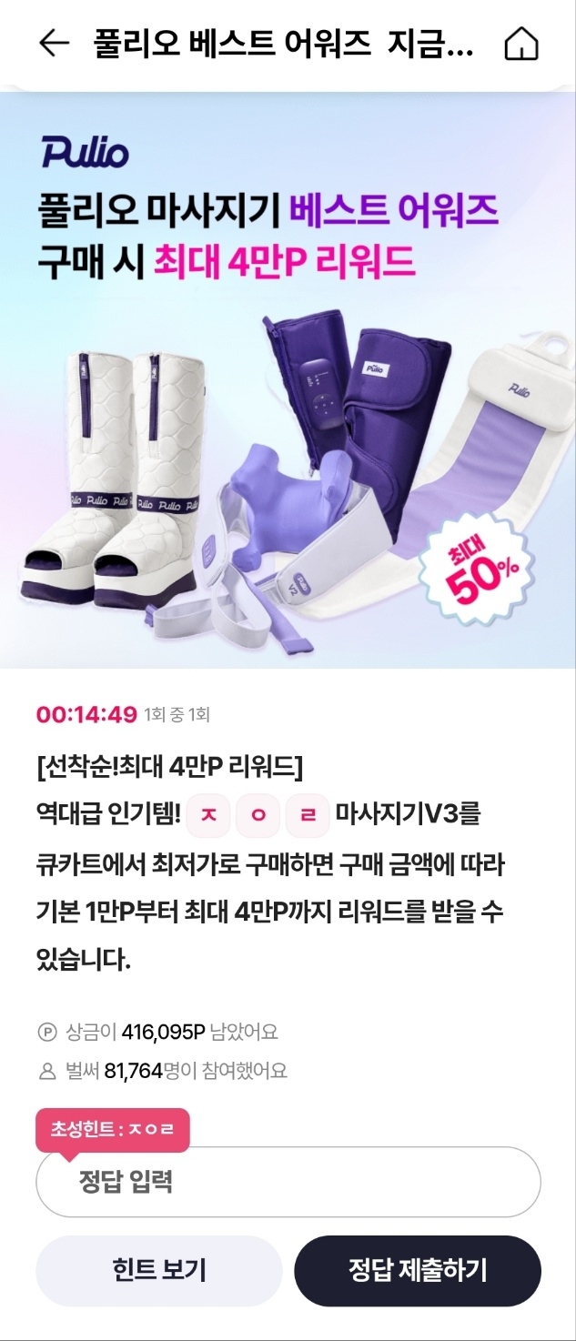 풀리오 베스트 어워즈 지금이 역대 최저가! 선착순 최대 4만P 리워드! 역대급 인기템 ○○○마사지기V3를 큐카트에서 최저가로 구매하면 최대 4만P 리워드를 받을 수 있습니다.