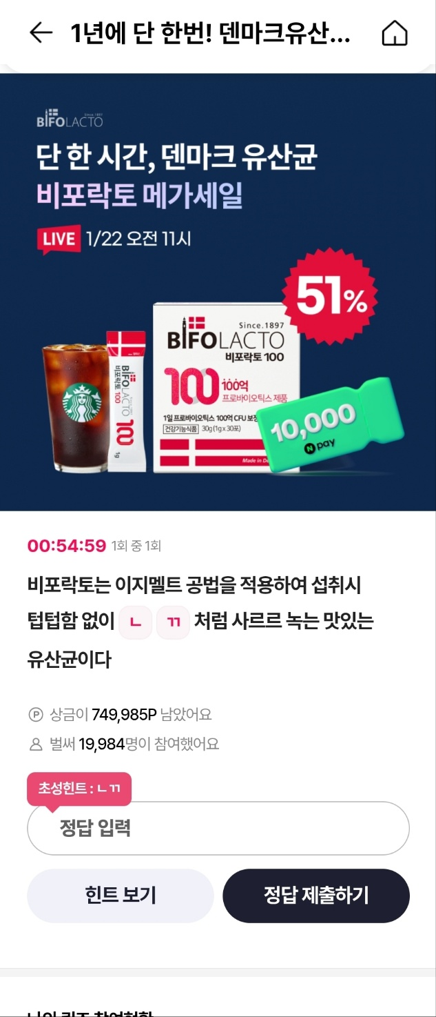 문제: 1 ○라이브 X 종근당건강! 25년 새해 복 선물하는 최대 혜택 LIVE★ 락토핏/프로메가/아임비타/홍삼정스틱 등 라이브 특가 오픈! 방송 중 구매왕에게 갤럭시워치7(1대)+프로메가 뉴티지오메가3 듀얼 1년치(12박스) 추첨 증정까지! 이외에 풍성한 사은품 이벤트 진행~! 단 1시간, 라이브 찬스 놓치지마세요! (힌트: 영어 대문자로 작성해 주세요)