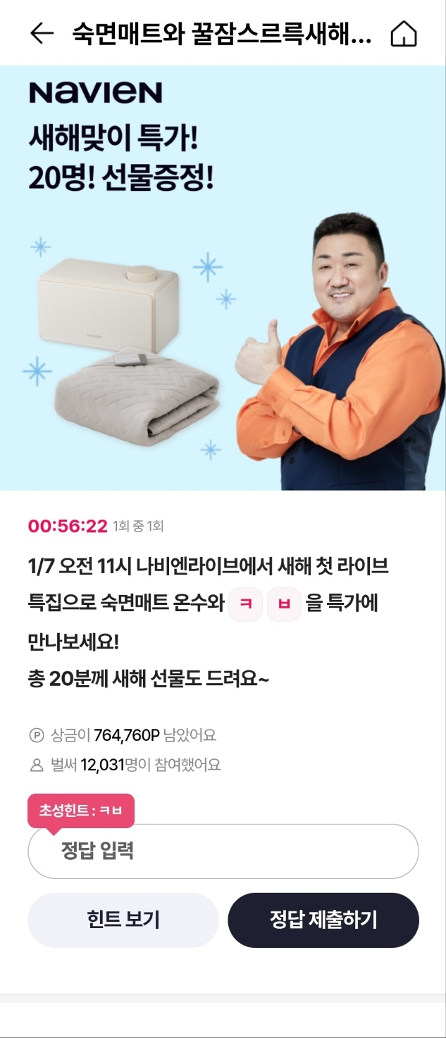 문제: "나비엔라이브에서 새해 첫 라이브 특집으로 숙면매트 온수와 ○○을 특가에 만나보세요!"