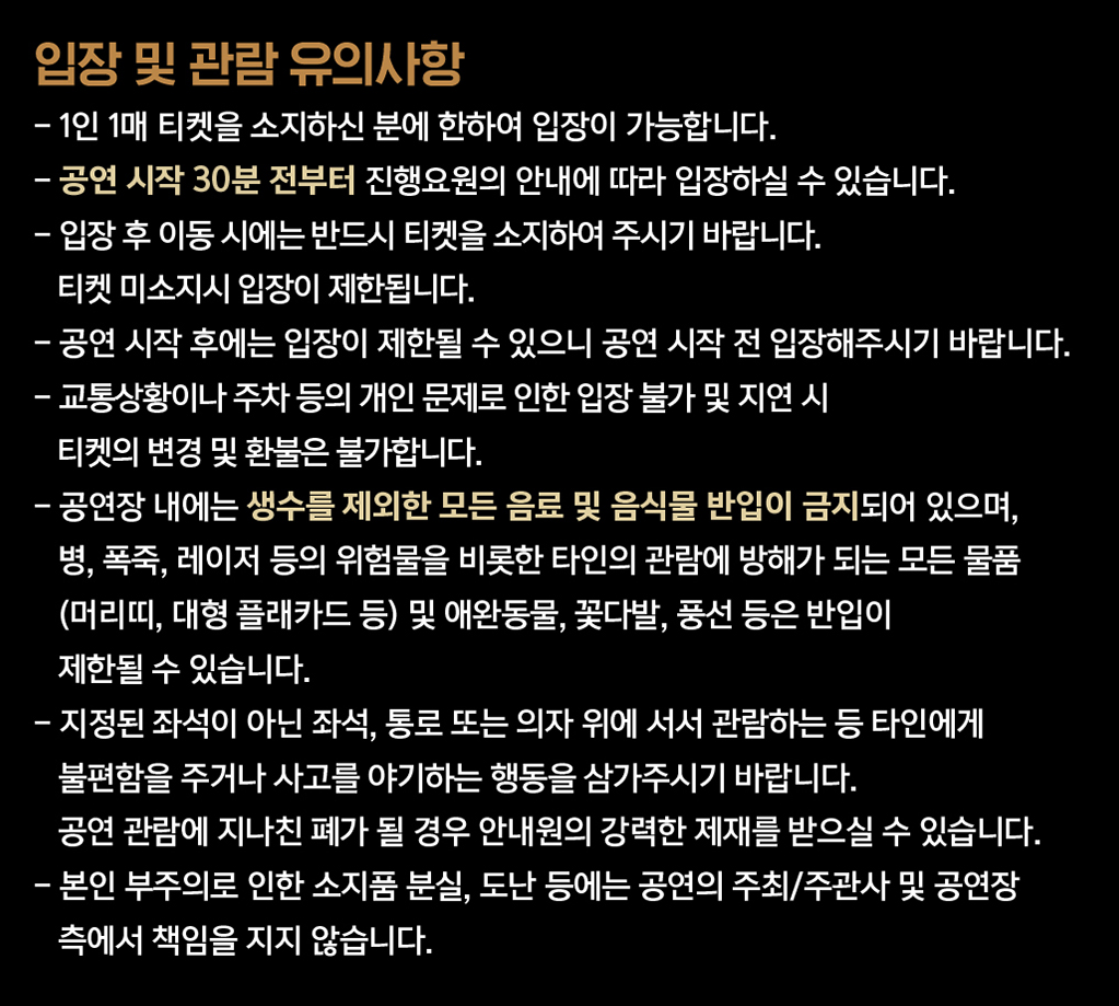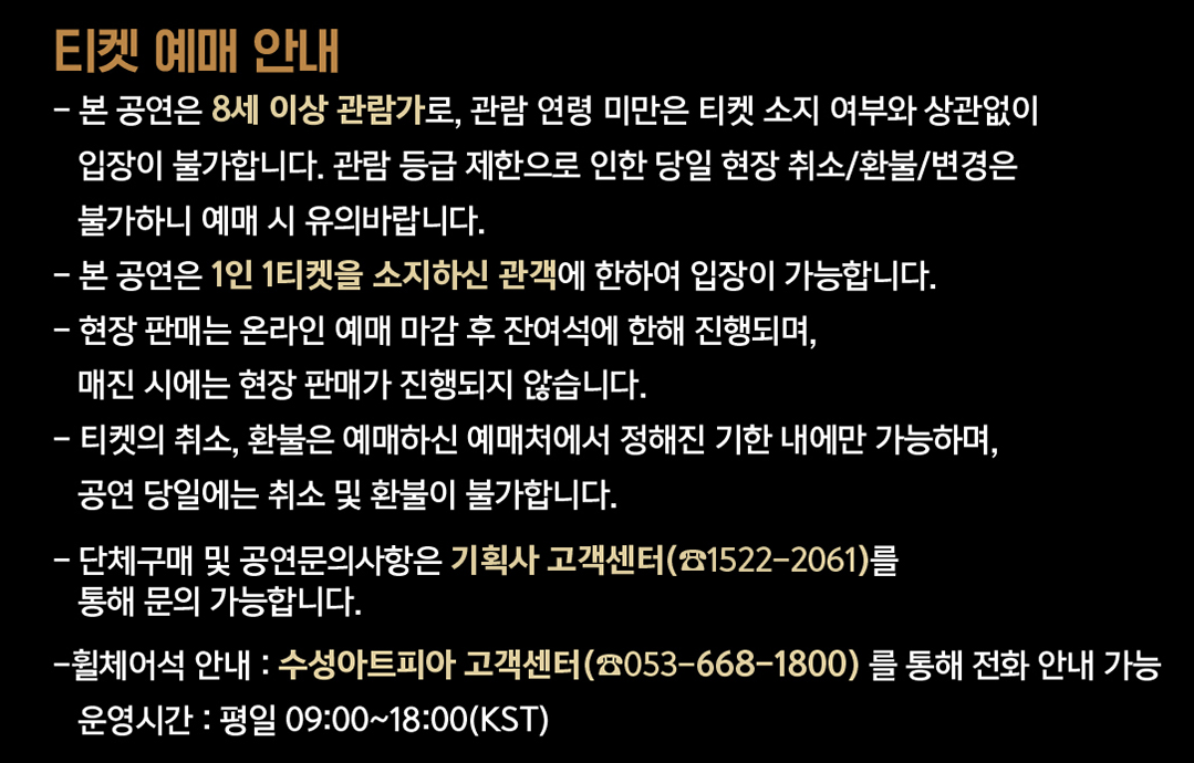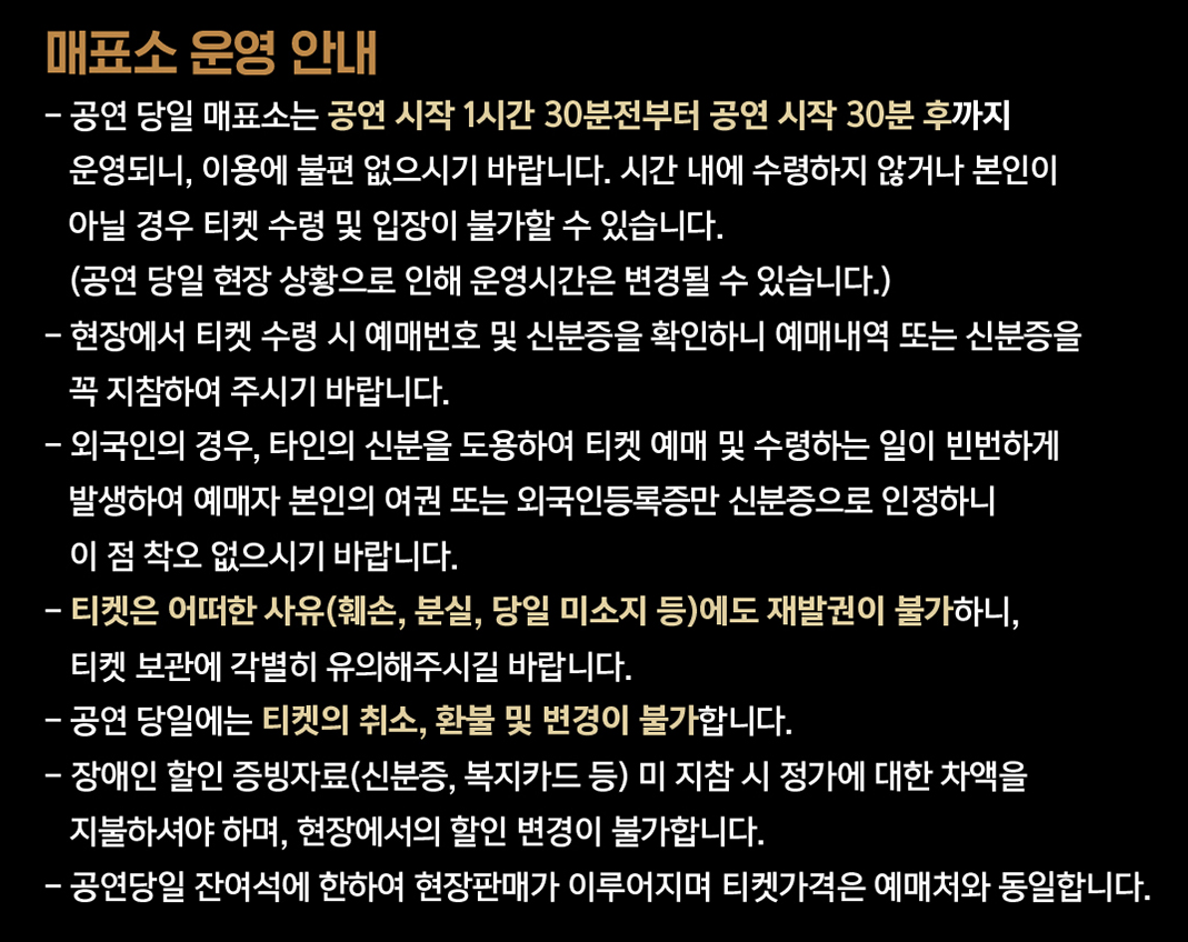- 티켓박스는 공연 시작 1시간 30분 전부터 운영
