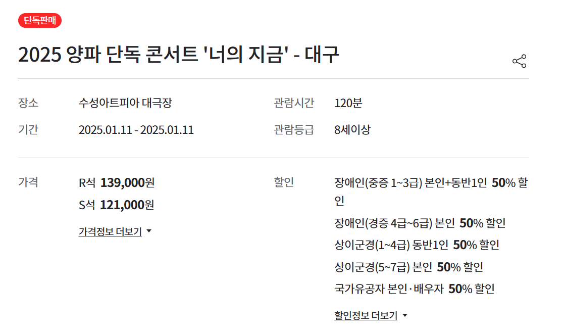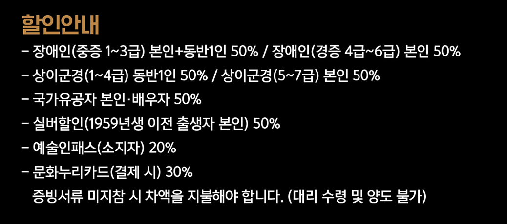 - 국가유공자, 실버 할인, 예술인 할인: 최대 50% 할인 적용