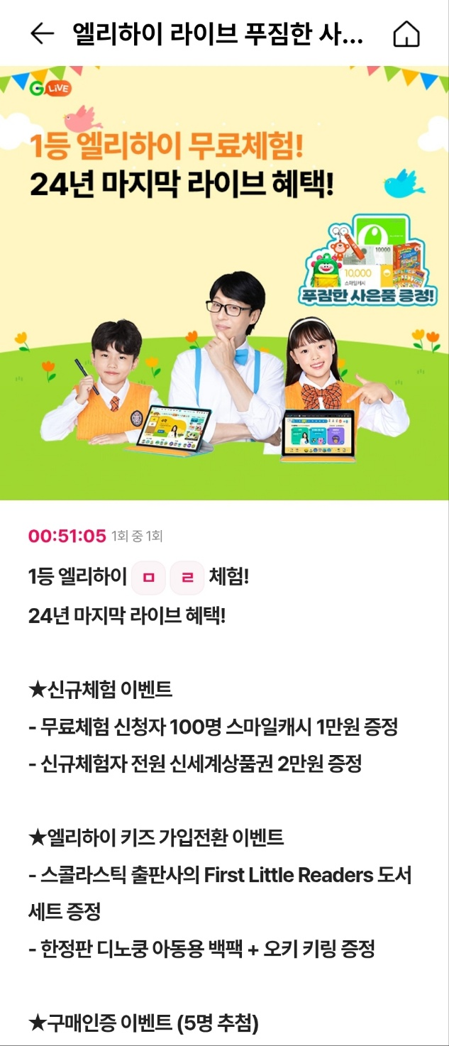 - 문제: 1등 엘리하이 ○○체험! 24년 마지막 라이브 혜택! 신규체험 이벤트 - 무료체험 신청자 100명 스마일캐시 1만원 증정 - 신규체험자 전원 신세계상품권 2만원 증정 엘리하이 키즈 가입전환 이벤트 - 스콜라스틱 출판사의 First Little Readers 도서 세트 증정 - 한정판 디노쿵 아동용 백팩 + 오키 키링 증정 구매인증 이벤트 (5명 추첨) - 올리브영 기프트카드 2만원 증정