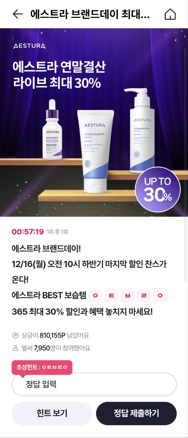 - 문제: "에스트라 브랜드데이! 12/16(월) 오전 10시 하반기 마지막 할인 찬스가 온다! 에스트라 BEST 보습템 ○○○○○365 최대 30% 할인과 혜택 놓치지 마세요!"