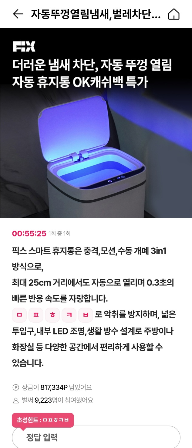 오전 10시에 출제된 퀴즈는 픽스 스마트 휴지통과 관련된 문제였습니다. 해당 제품은 충격, 모션, 수동 개폐 기능을 갖춘 3in1 방식의 휴지통으로, 자동으로 열리는 스마트한 기능이 특징인데요. 냄새를 차단하는 기능을 하는 것은 무엇일까요?